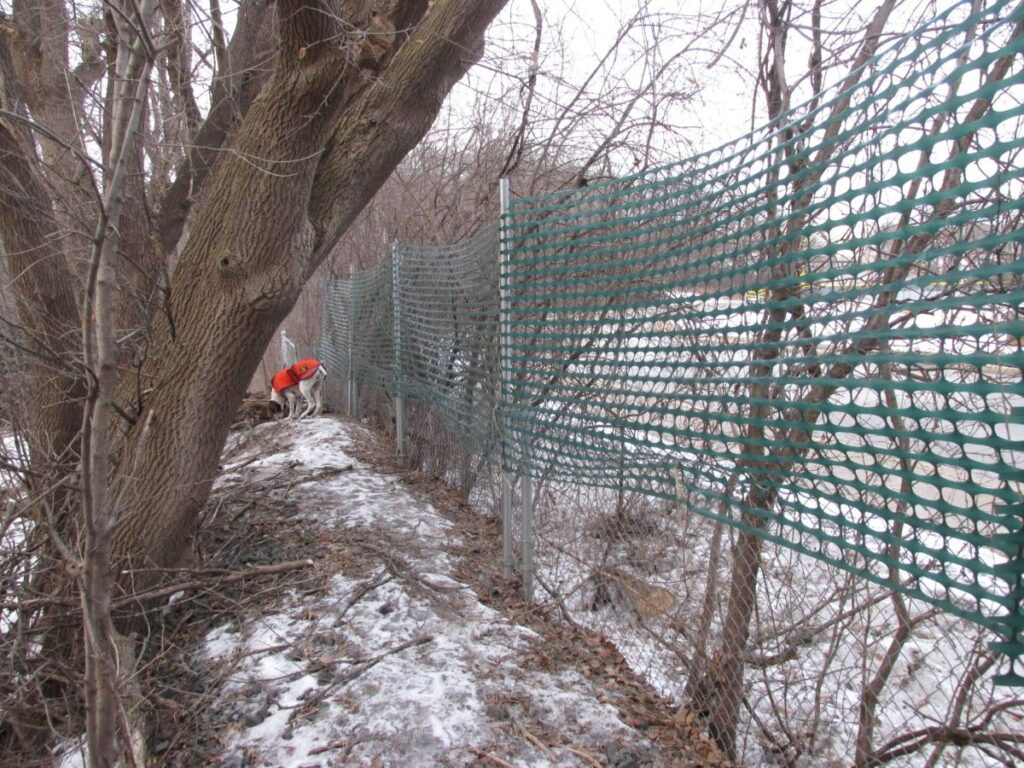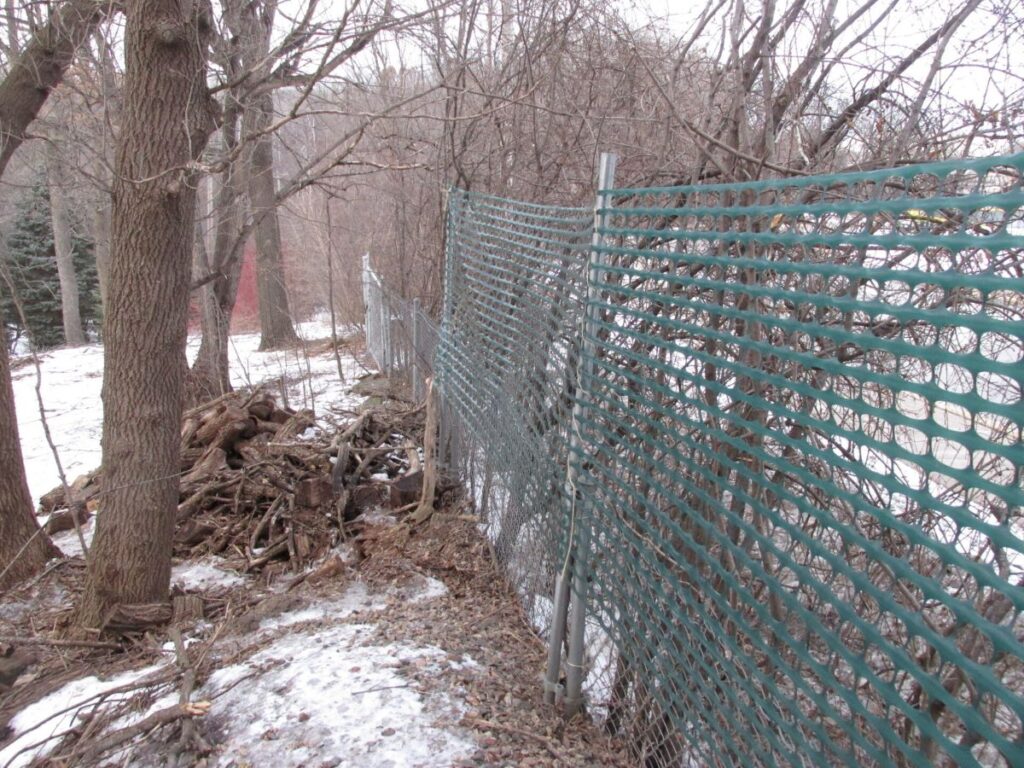 On the inside of the fence the previous owners had piled dirt, gravel and tree branches along the fence. It was piled so high that the lower three feet of a five foot fence were buried. I had to add an extension on top of the fence to keep from hopping over.