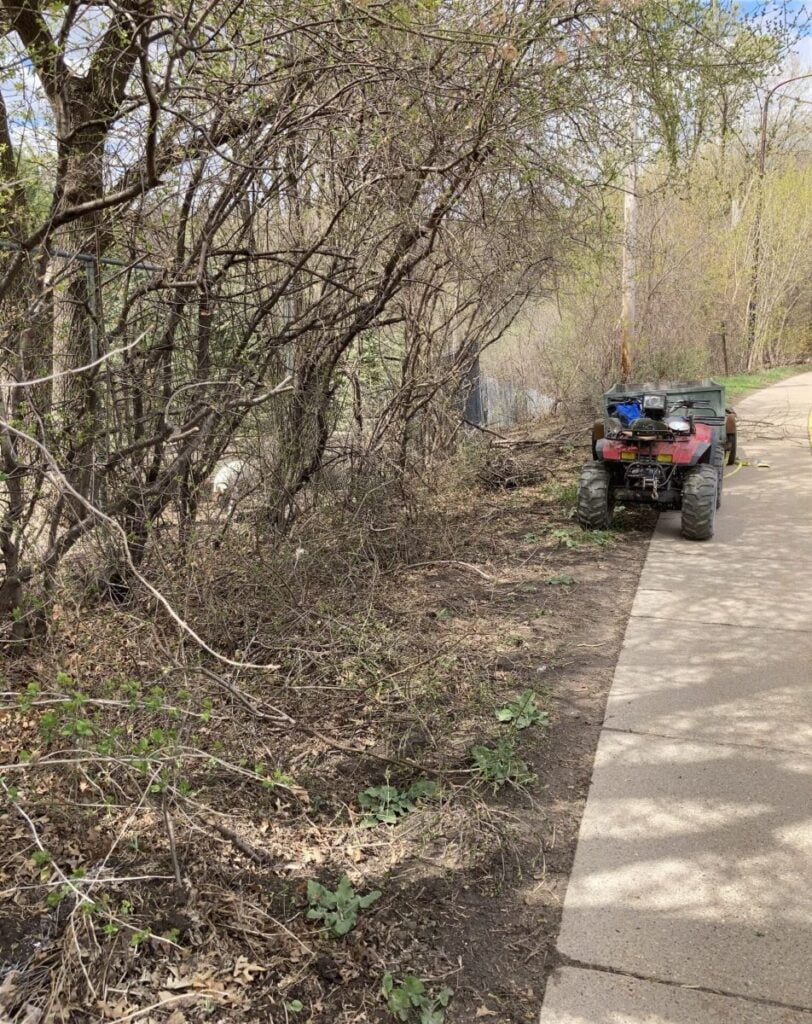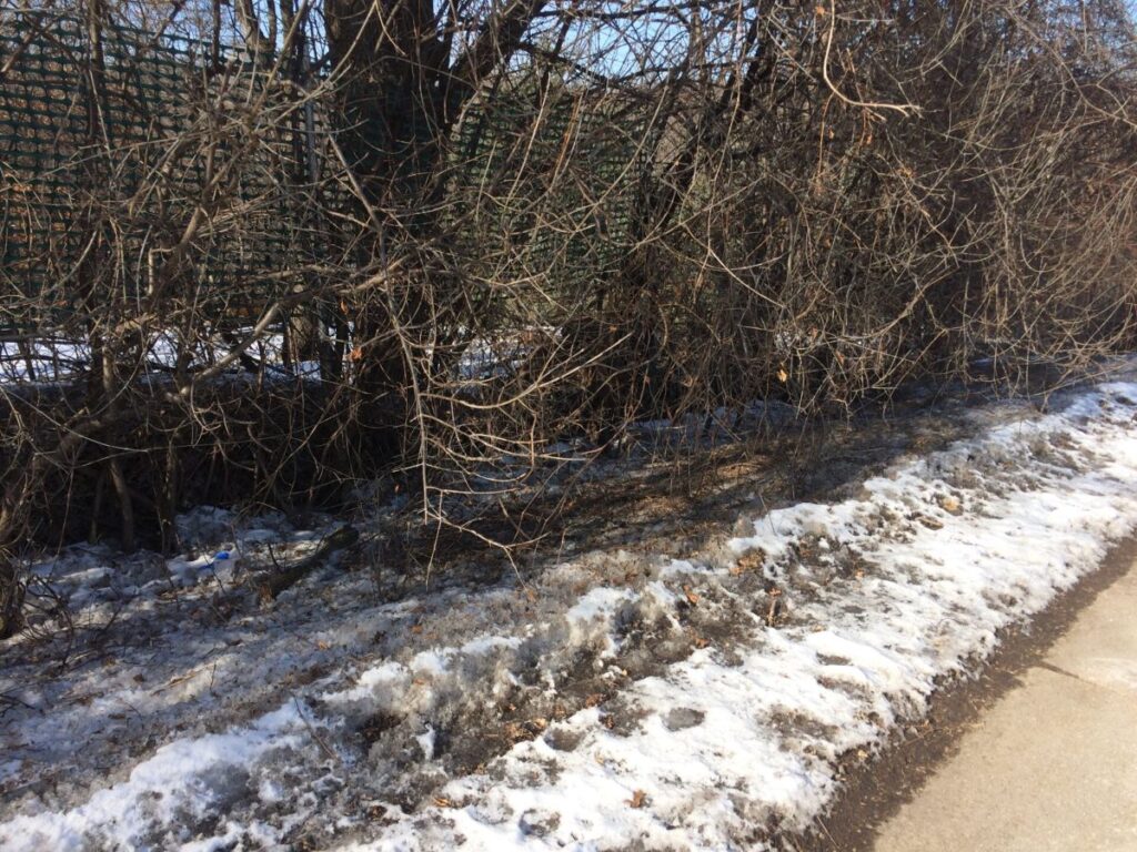The area between the fence and the sidewalk was totally overgrown with Invasive Buckthorn, various weeds and trash. During the summer, the Buckthorn would grow to the east and overhand the sidewalk. The sidewalk leads down to the high school and a city park so it is heavily used.