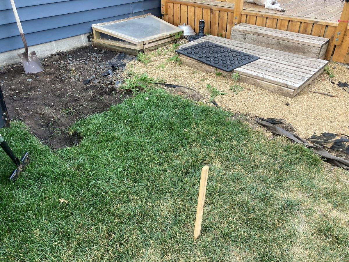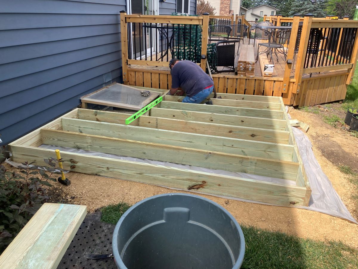 Cary came over to help with the construction. The frame was built out of ground contact treated lumber. The base was almost perfectly level east to west so no adjustments were required. We were able to use blocks to level the deck north and south without impacting the slope of the base. One complication was the egress window. We had to frame around it since it is required for the basement.