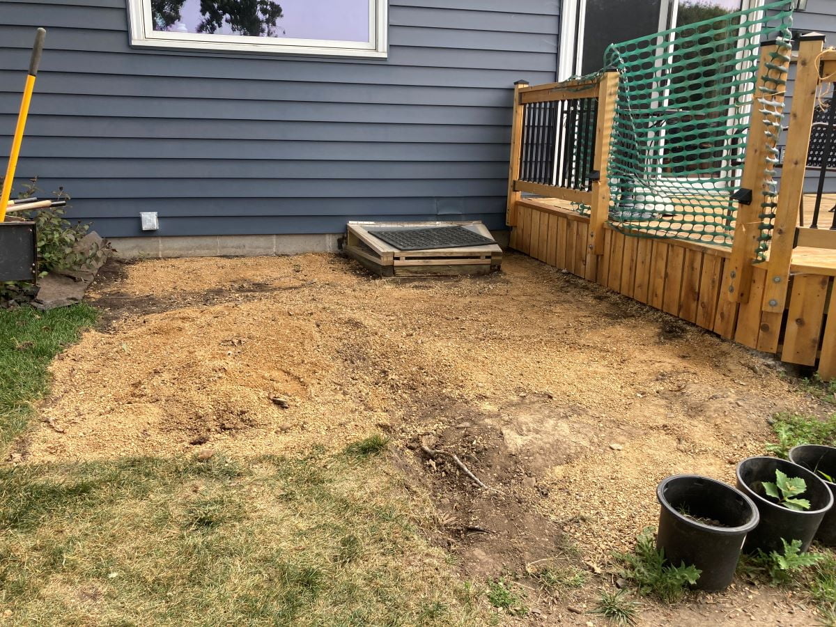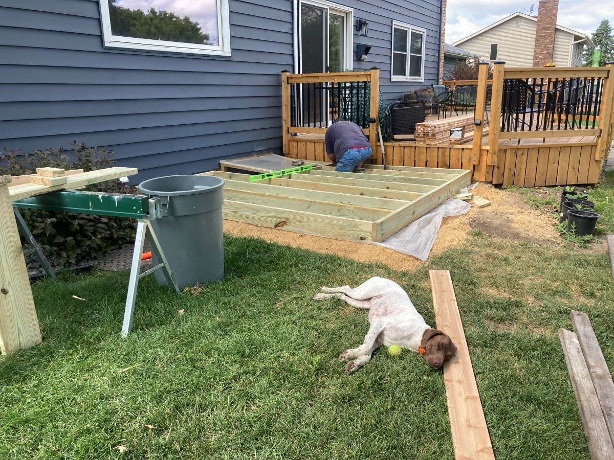 We decided to build a simple ground level deck. This deck is not attached to the house or the existing deck so it can rest on the ground without footings. Once we finish the landscaping it will be a perfect place to grill and/or access the yard.