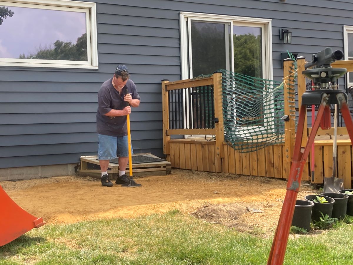 I started out by removing the rock and sod from where we were going to build. Then I backfilled the area with crushed limestone. It is easy to work with and when it gets wet it kind of sets up. With Cary’s help, we used a transit and a raketo give it a slight slope away from the houseĀ then packed it in. We laid a sheet of plastic over the limestone before we started framing. This was the final step on the first day.