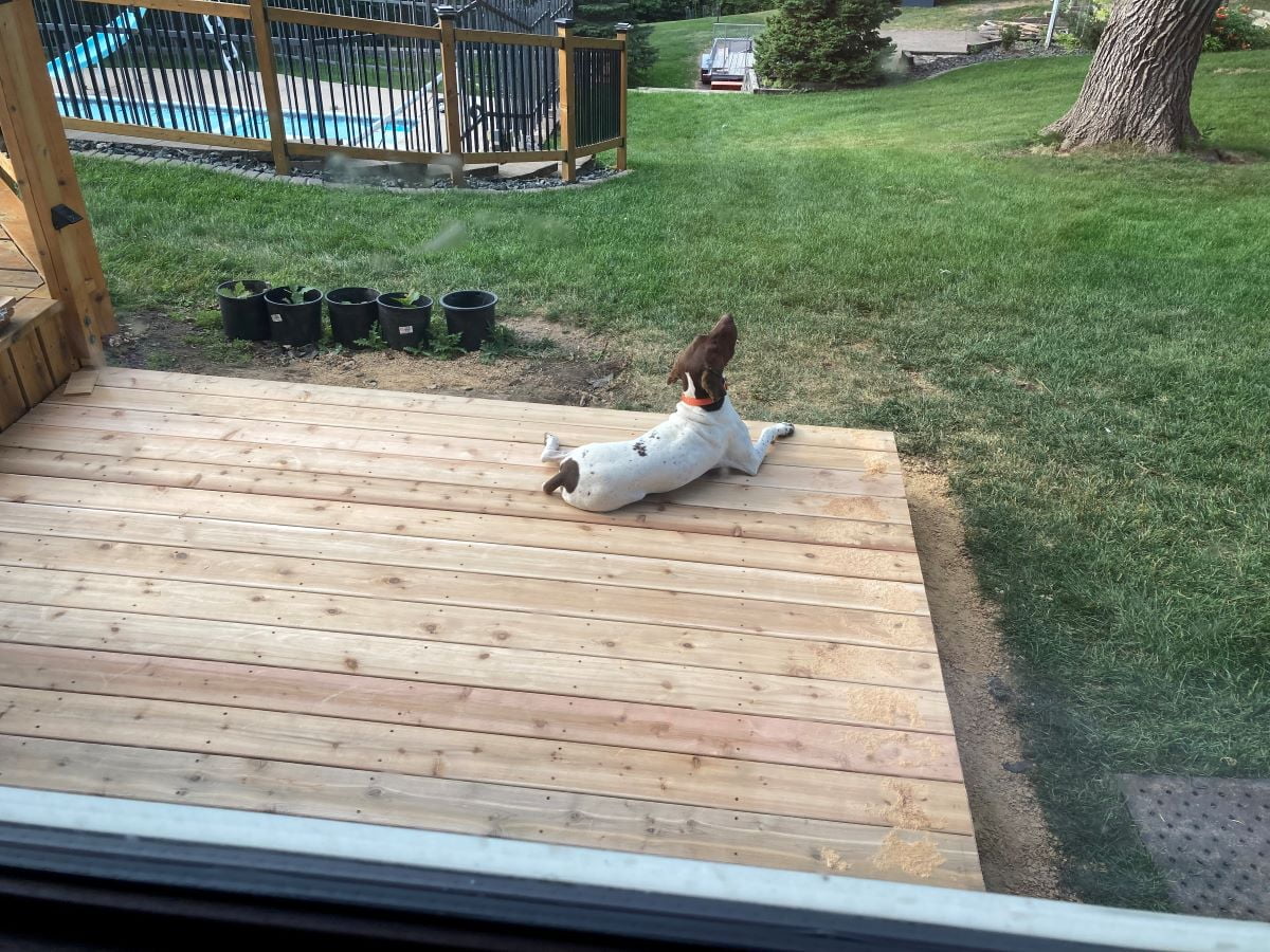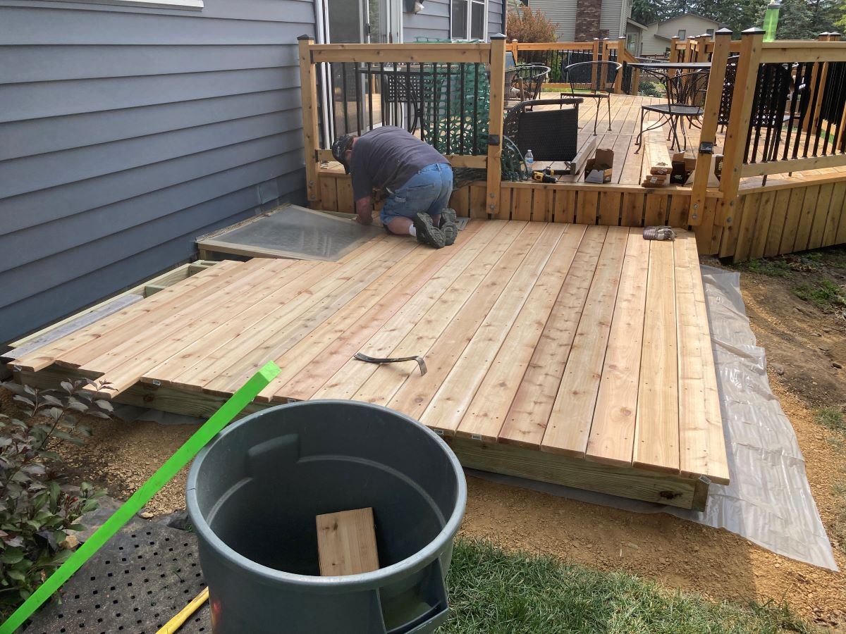 Once the frame was complete, we then laid done the cedar deck boards. This went pretty quickly until we got to the egress window and after that it went slower because I had to custom cut each board. That ended our second day.