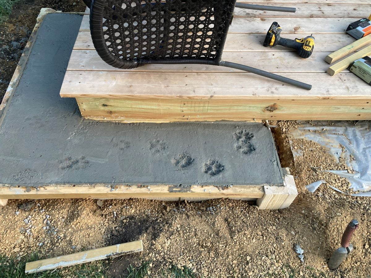 I started the process by building a step from the corner of the deck down to the yard. I built forms and then poured a concrete base. The first picture in the gallery shows Willow’s footprints through the wet concrete. Not a big deal because I placed large pavers on the base.