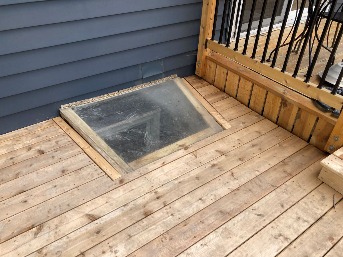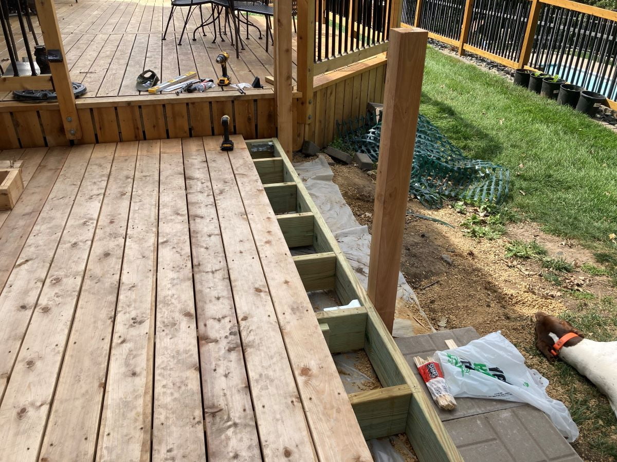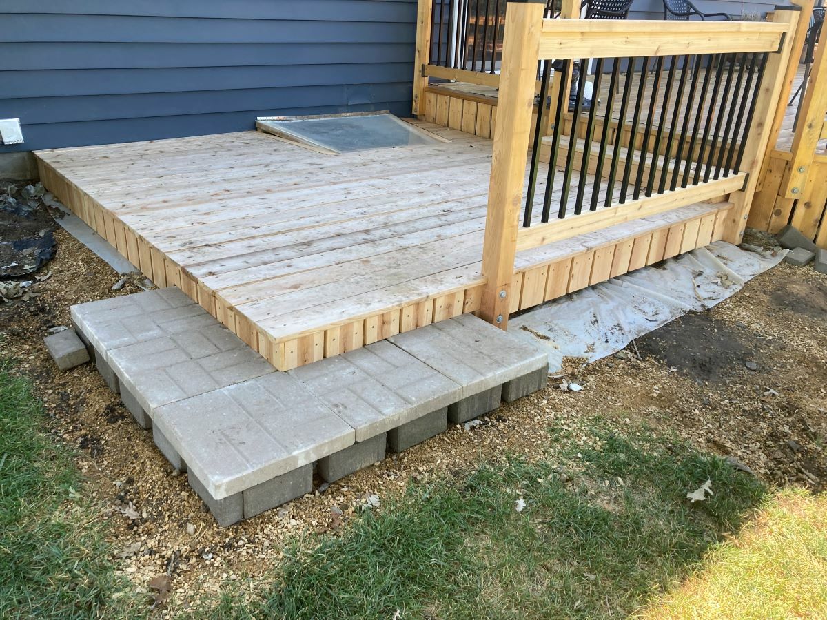 The construction phase of the ground level deck is complete. After the initial construction was done we realized that the step off the deck was too high, particularly close to the main deck due to the grade. So we needed a railing to prevent accidents. We also needed a step down to ground level. The dogs decided that the gap around the egress window was too large and that they should be able to catch mice if they just tried to dig through the deck boards.