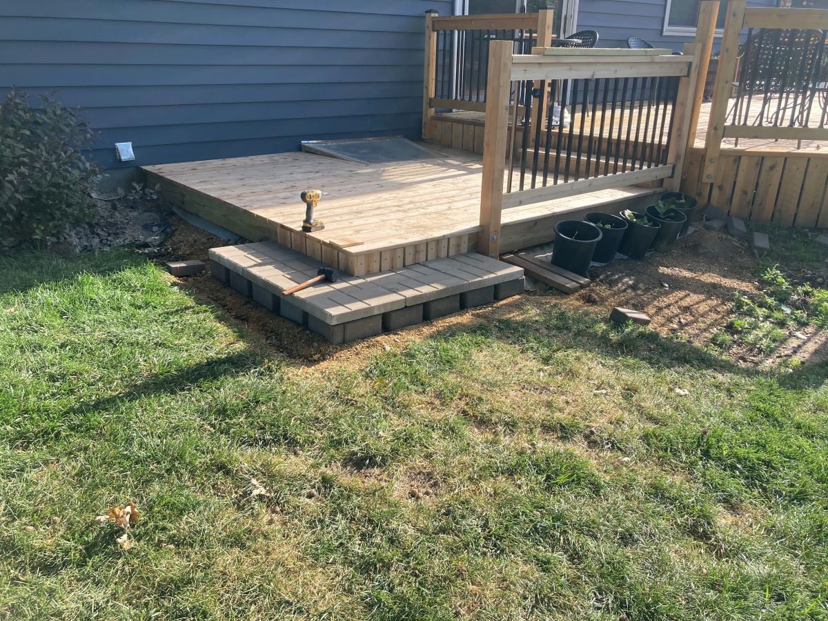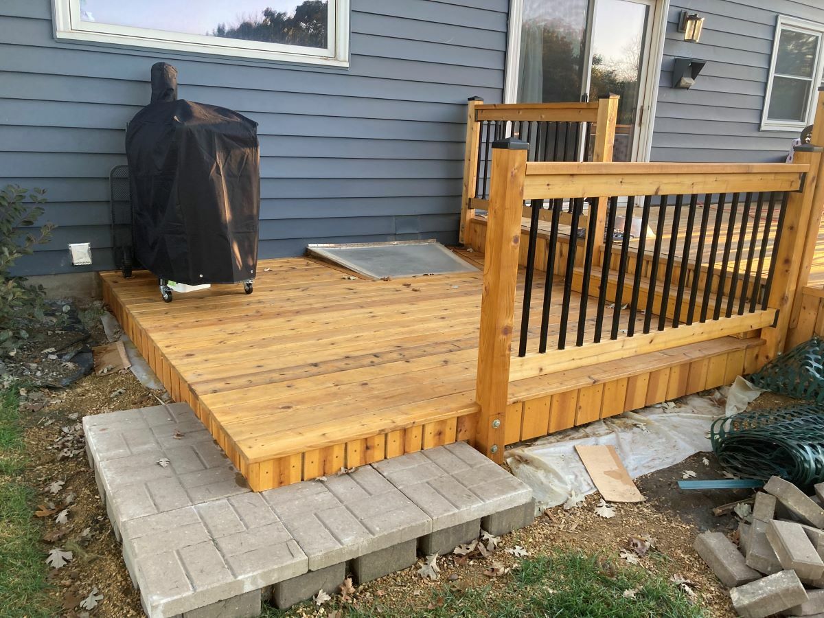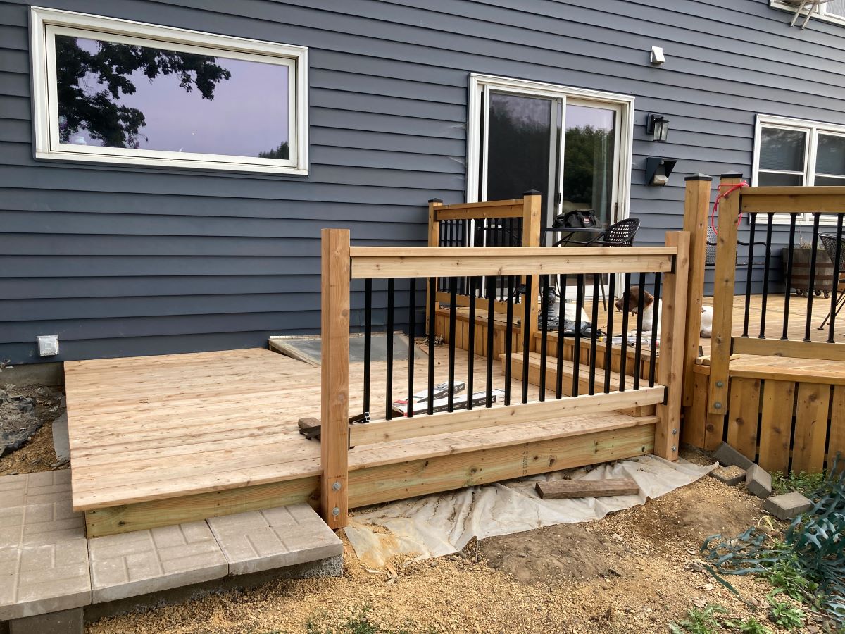 The construction phase of the ground level deck is complete. After the initial construction was done we realized that the step off the deck was too high, particularly close to the main deck due to the grade. So we needed a railing to prevent accidents. We also needed a step down to ground level. The dogs decided that the gap around the egress window was too large and that they should be able to catch mice if they just tried to dig through the deck boards.